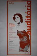 Cartaz de divulgação do programa do Auditório Municipal Fernando Lopes Graça para o mês de julho de 2002, com especial destaque para o Festival de Teatro de Almada. Outros espetáculos: Naif Theatre; Tomeo Vergês; Recital Sophia de Mello Breyner Adresen; Efémero; Shaubühne Am Lenhiner Platz; Útero. Sessões de cinema: Sala de Pânico; O Fabuloso Destino de Amélie; O Senhor dos Anéis; Baladas Bailadas. Contém a fotografia a preto e branco de uma atriz. Contém o logótipo, a morada e os contactos do Fórum Romeu Correia. Contém os logótipos da Câmara Municipal de Almada e do auditório.