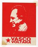 Contem imagem impressa a vermelho sobre fundo branco do busto de Vasco Gonçalves com a seguinte legenda: VASCO VOLTARÁ.