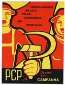 Contem imagem de um operário e uma camponesa estilizados com a seguinte legenda: TRABALHADORES / EM / LUTA / PELAS / CONQUISTAS / DA / REVOLUÇÃO / PCP / Centro / T.lho / CAMPANHÃ.