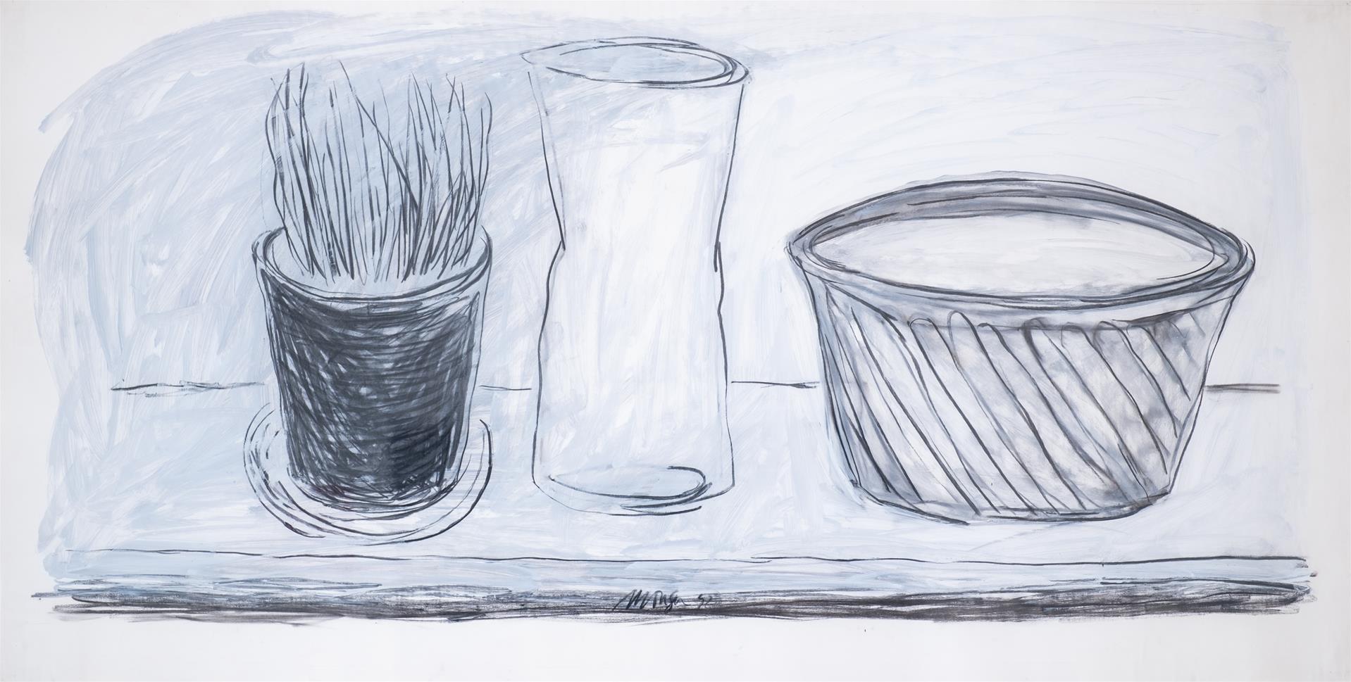 Representação de três objectos distintos, alinhados sobre uma mesa. Da esquerda para a direita, um vaso com rebentos de erva, uma jarra e um outro recipiente que sugere um alguidar. Estão dispostos no sentido horizontal e ocupam praticamente toda a superfície da folha. Sobre os contornos acentuados, a carvão, e a restante superfície, destaca-se uma camada em cinza.
