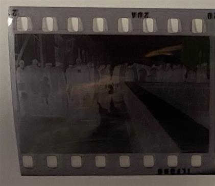 Exposição 1 de uma tira de negativo de celulose de 3 exposições onde se vêem pessoas em andamento no cais de embarque do Ginjal em Cacilhas.