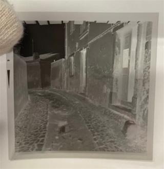 Negativo onde se vê um troço da Avenida Engenheiro Frederico Ulrich, atual Avenida 25 de Abril, em Cacilhas. Ao centro vê-se uma varanda com o muro partido e uma escada. Encostada em parte do muro está uma mulher; do lado de fora do muro está uma criança. No topo, a cobrir a varanda, vê-se uma sequência de ripas. À frente do muro está uma estrada e, ao fundo, vê-se arvoredo e várias construções.