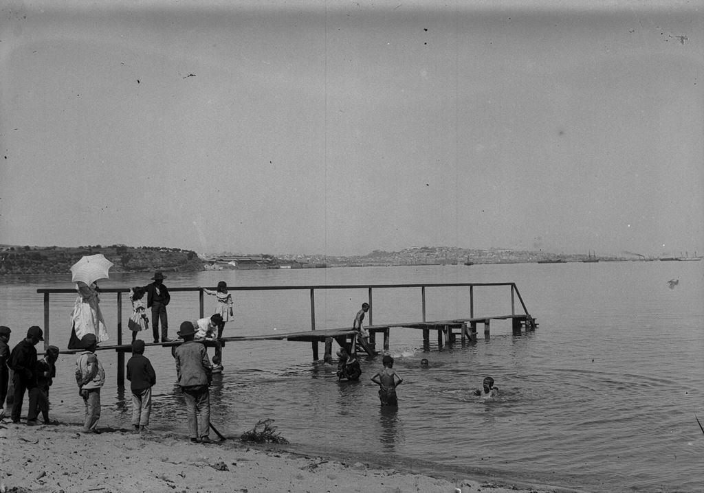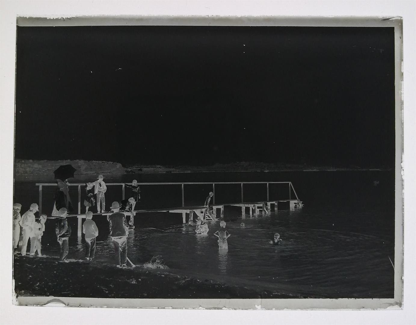 Negativo isolado em que se veem crianças e adultos num cais de madeira na praia da Mutela / Caramujo, sendo percetível a diferença social entre a família de António José Gomes e as crianças que observam na areia ou que se banham no Tejo. Ao fundo vemos o morro da Margueira e os edifícios das fábricas corticeiras junto ao rio, a ponta de Cacilhas e, por trás, Lisboa.  Nesta época era comum o uso balnear e recreativo das praias fluviais, designadamente nas margens do mar da Palha.