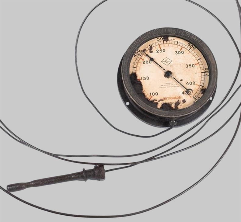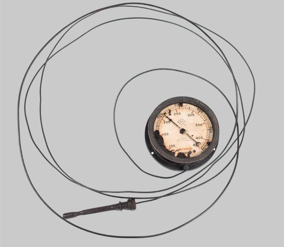 Era usado nos navios a vapor da Companhia Portuguesa de Pesca para medir a temperatura das caldeiras, que poderia variar entre os 100 a 430 graus centigrados ou entre os 200 a 800 graus Fahrenheit. Este tipo de termómetro permitia a leitura da temperatura a uma distância considerável, sendo muito utilizado em locais de díficl acesso, nos quais se colocava a sonda com o piloro.