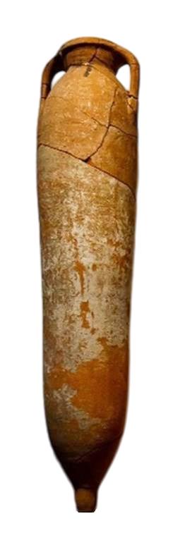 Ânfora Almagro 50, com perfil completo, reconstituída a partir a partir dos fragmentos originais. Corpo tendencialmente piriforme invertido, carena alta suave, colo troncocónico reto, conserva as duas asas originais, ambas em posição vertical, de secção fitiforme, localizadas entre o colo e o bordo da peça.