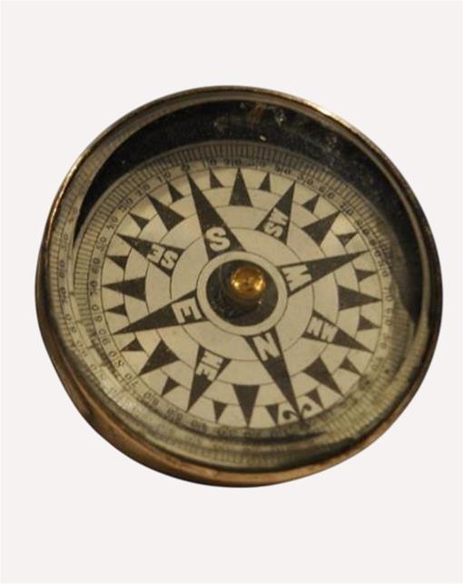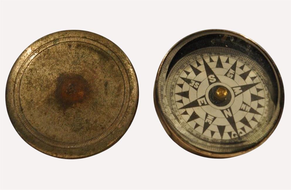 Esta bússola pertenceu ao bisavô do Carlos Figueiredo, António Joaquim Simões, conhecido pela alcunha de “Cavaco”, tendo sido passada de geração em geração. Era António Joaquim Simões quem transportava os monarcas no bote para o Porto Brandão, aquando das caçadas que fazia nesta margem. Transportava ainda os barris que eram feitos no Porto Brandão para a Quinta da Arealva (Olho de Boi) e para a Teotónio Pereira (Ginjal). Sempre preferiu a bússola para navegar e era um objeto imprescindível nas suas deslocações pelo rio.