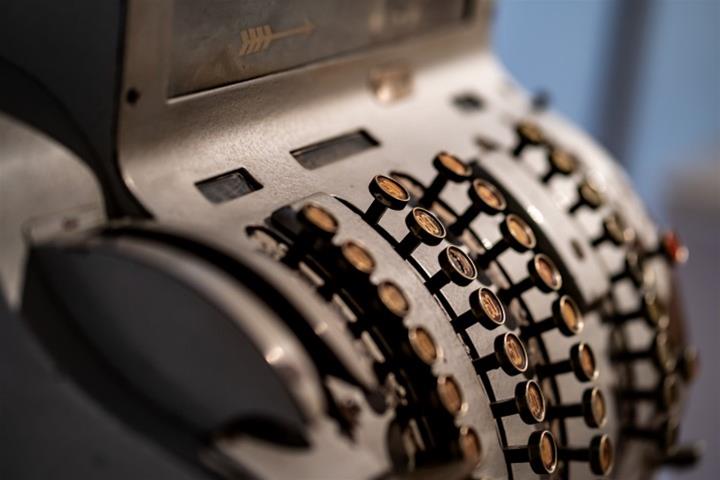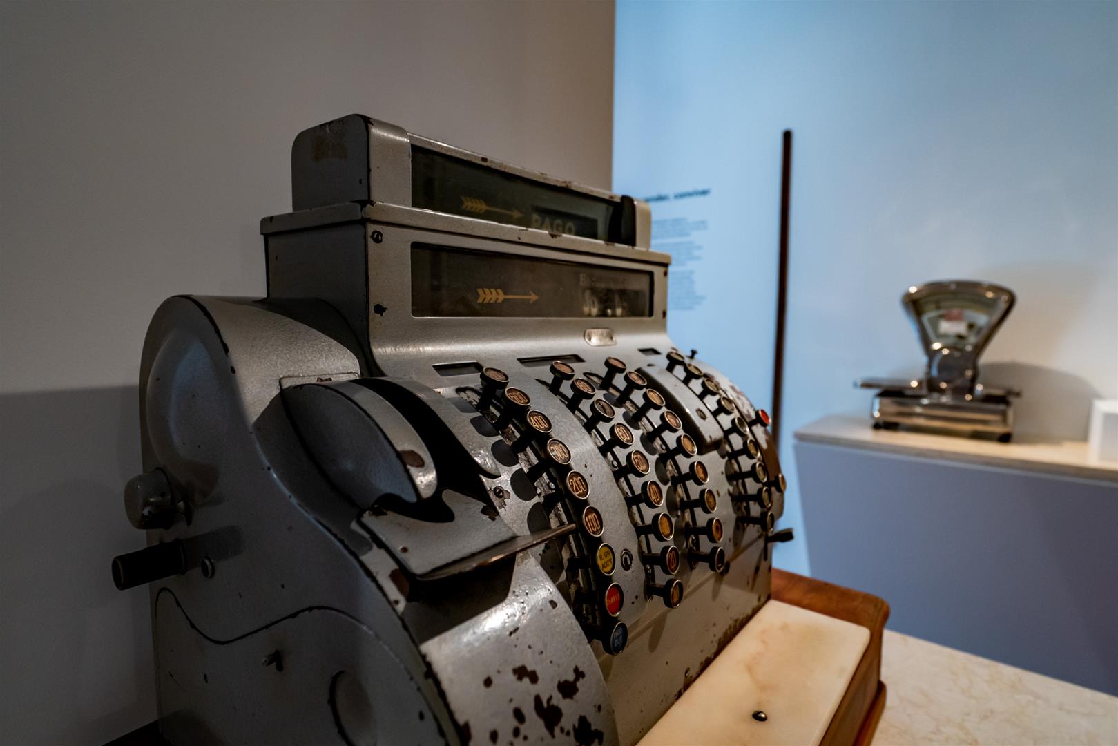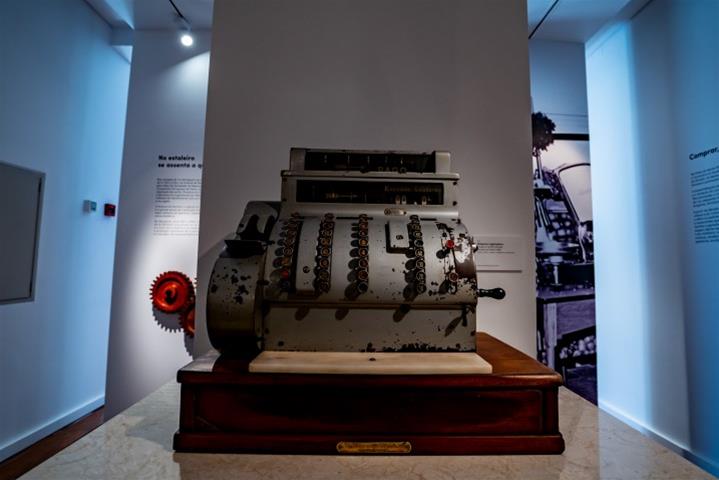 Máquina simples acionada a manivela que faz movimentar os mecanismos das várias operações e permite abrir a gaveta existente na base para o dinheiro das transações comerciais.